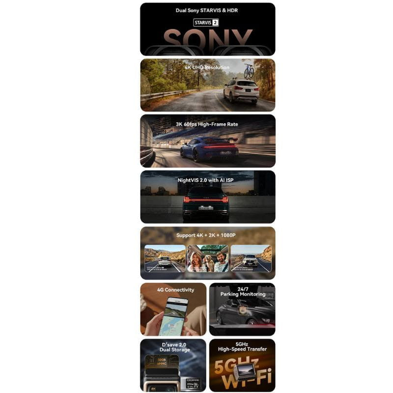 Triple canal real 4K + 1080p + 2K con sensores Sony STARVIS 2 y HDR en ambos canales principales, más una tercera cámara MINI2X (2K) incluida en el set. Suma NightVIS 2.0 para mejor noche y D²save 2.0 con 32 GB eMMC como respaldo a la microSD.