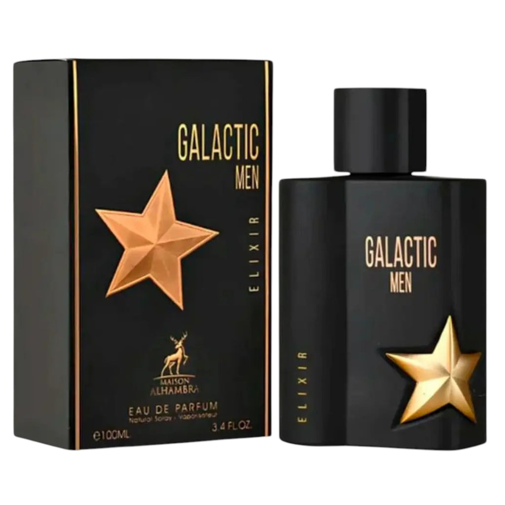 Maison Alhambra Galactic Elixir Men Eau de Parfum 100 ml (lanzado en 2023) es una fragancia masculina intensa, misteriosa y sofisticada que combina notas amaderadas, especiadas y ambaradas, creando un aroma poderoso con gran carácter. Inspirado en perfumes árabes de lujo, destaca por su profundidad, elegancia y una fijación superior ideal para noches y clima frío.