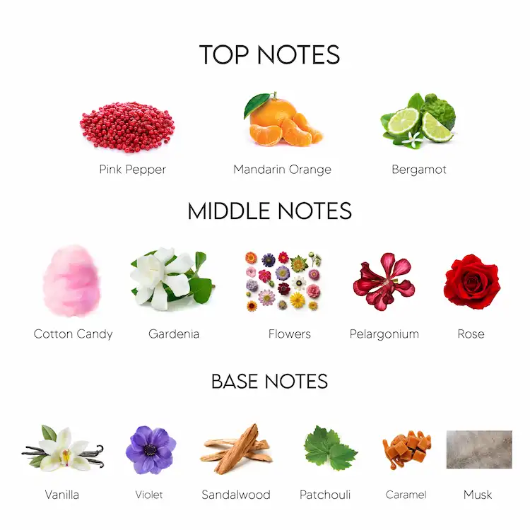 Las Notas de Salida son pimienta rosa, mandarina y bergamota; las Notas de Corazón son algodón de azúcar, gardenia, flores, pelargonio y rosa; las Notas de Fondo son vainilla, almizcle, sándalo, caramelo, violeta y pachulí.