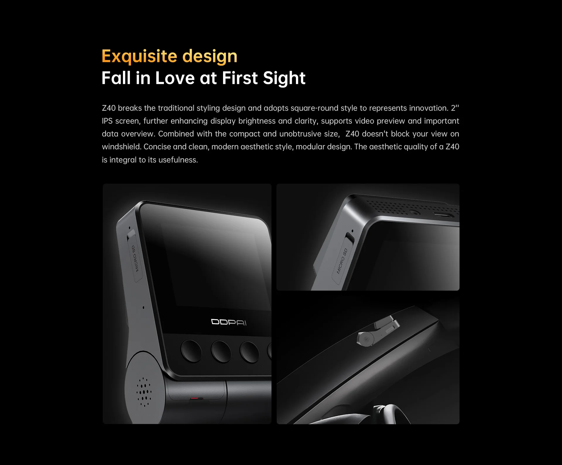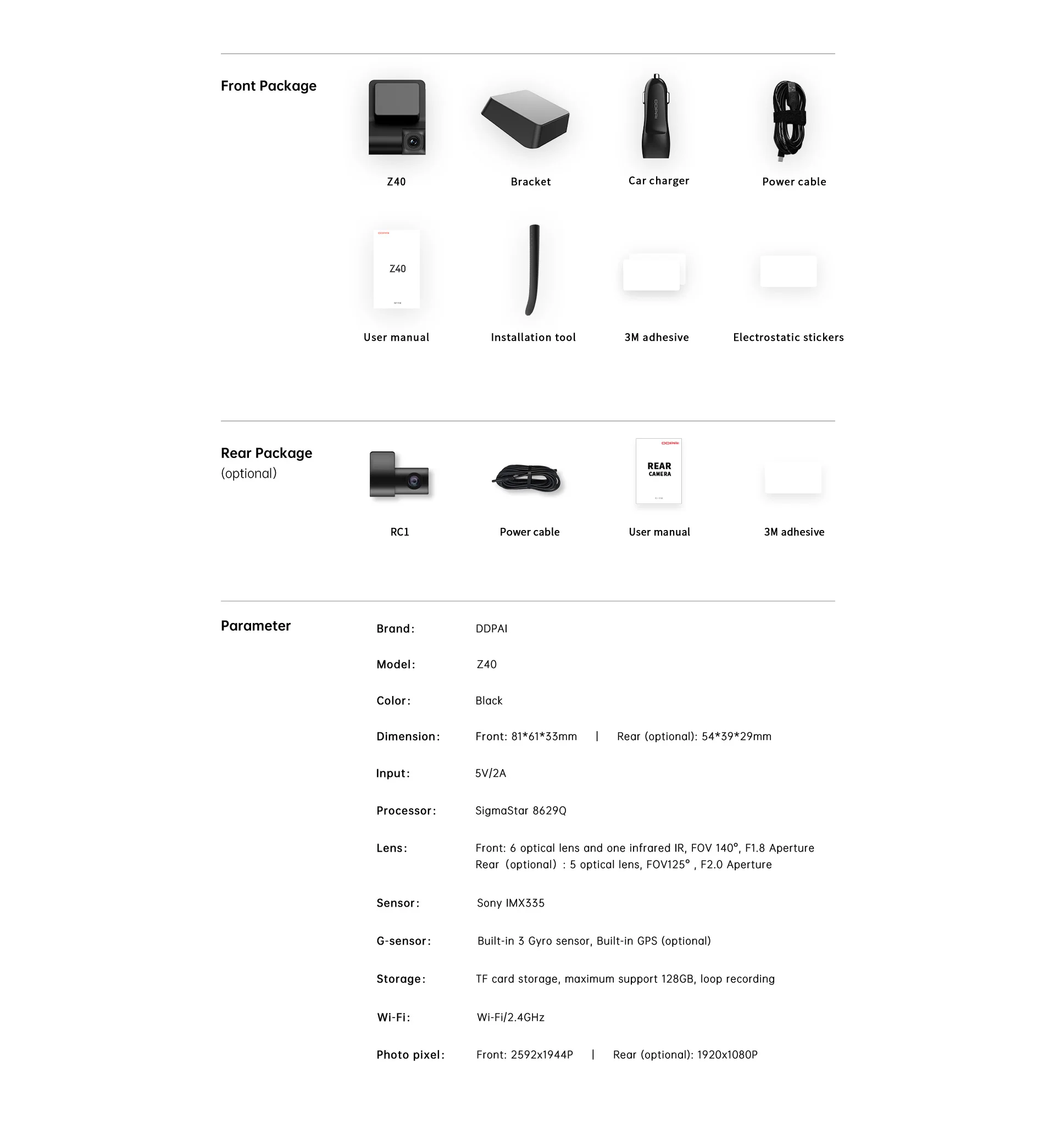 El Z40 dashcam está equipado con un sensor Sony IMX335, resolución de 2592 × 1944, 6 lentes ópticas (apertura F1.8). Z40 puede grabar vídeos más claros y nítidos incluso en condiciones de poca luz.