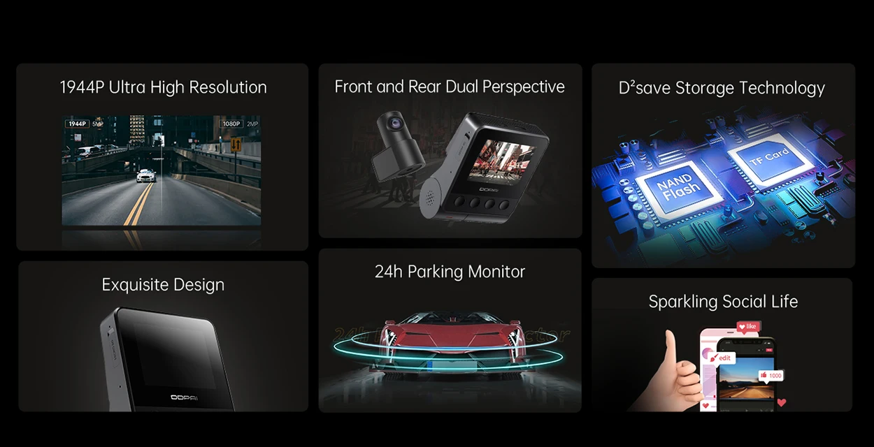 La exclusiva tecnología de imagen Realcube desarrollada por DDPAI es útil para capturar cada marco con una mejor disposición de píxeles y mayor brillo, color preciso y mejor calidad de imagen. Las cámaras delanteras de gran angular (140 °) y traseras (125 °) ofrecen una amplia visión y protección integral. La cámara trasera giratoria de 360 grados también toma selfies cuando quieras.