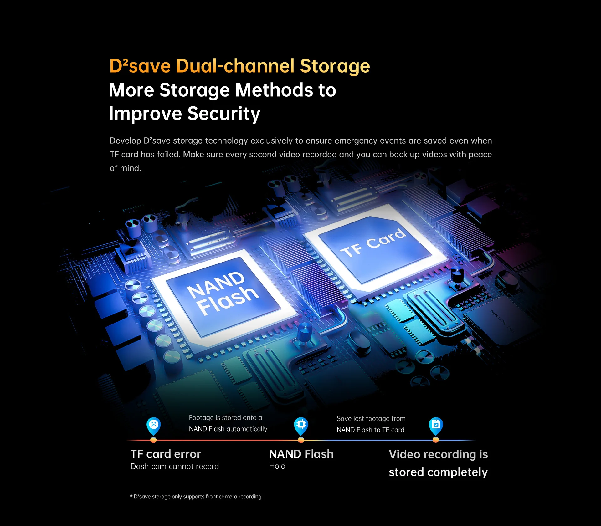 La cámara de salpicadero basada en supercondensadores admite la grabación de 3 ~ 4s incluso cuando la cámara de salpicadero se apaga. Además; DDPAI desarrolla de forma innovadora la tecnología de almacenamiento d² Save que el Flash NAND incorporado permite hacer una copia de seguridad de los vídeos con tranquilidad. Incluso cuando la tarjeta TF es anormal repentinamente, el vídeo de prueba por segundo se puede almacenar de forma segura.